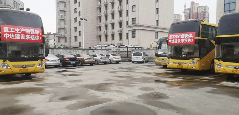 2月29日凌晨1點(diǎn),中達(dá)建設(shè)組織的兩輛大巴車(chē)從安徽順利接回了首批返崗工人,將他們?nèi)堪踩椭粮黜?xiàng)目現(xiàn)場(chǎng)。