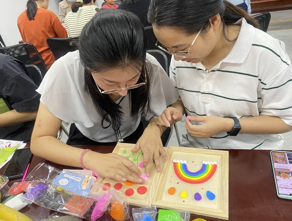 觀影結(jié)束后,大家熱血沸騰、滿懷激情,現(xiàn)場DIY制作國慶主題粘土畫,表達(dá)著對祖國的熱愛與祝福。大家用粘土勾勒紅色印記,用色彩點燃愛國情懷,用掌心和滿懷愛心描繪了一個又一個燦爛美好的中國夢。